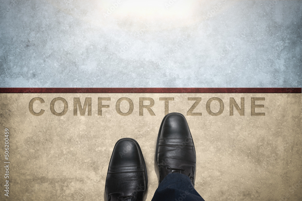 get out of your comfort zone. Comfort Zone Concept, Male with Leather Shoes Steps over a word with line on Concrete Floor, Top view