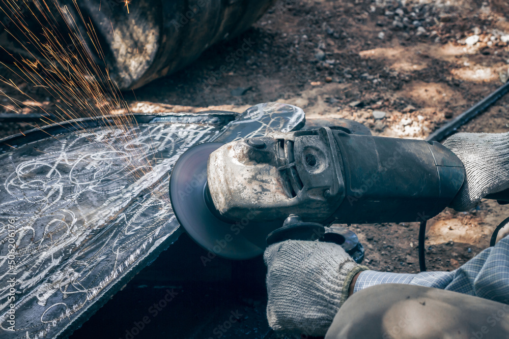 Electric wheel grinding on steel structure in factory Metal grinding on steel pipe with flash of sparks close up.