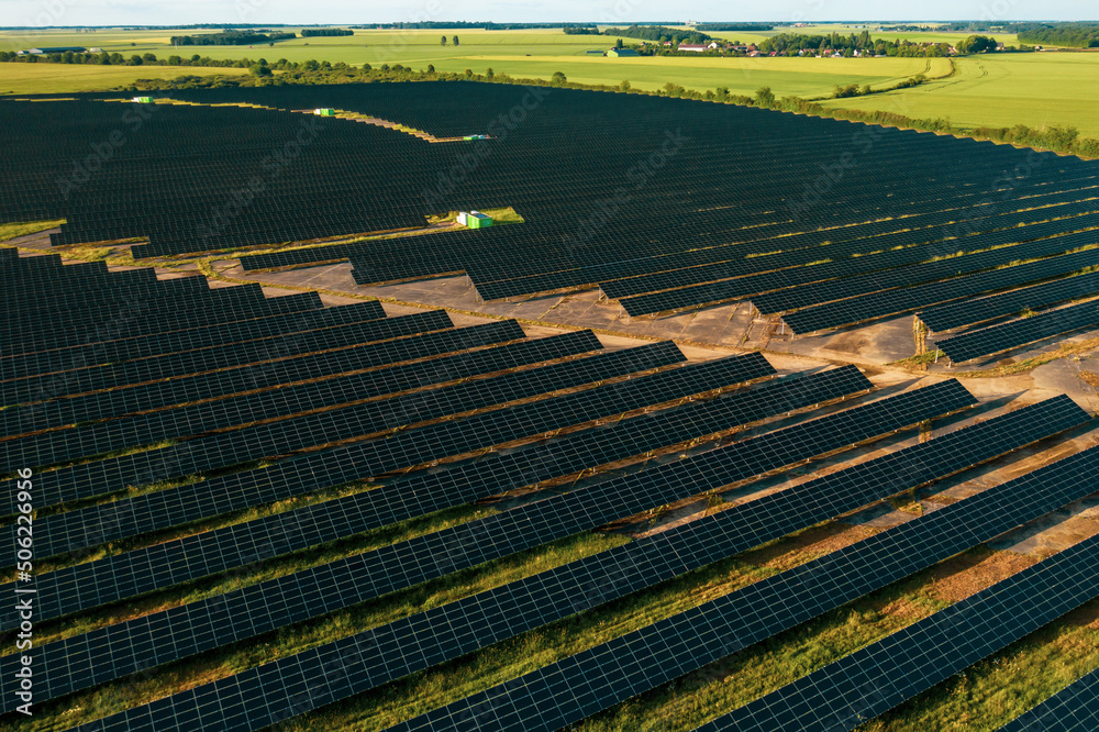 Large solar power plant on a picturesque green field. Solar panels in aerial view. Power plant using renewable solar energy with sun. Alternative source of electricity.