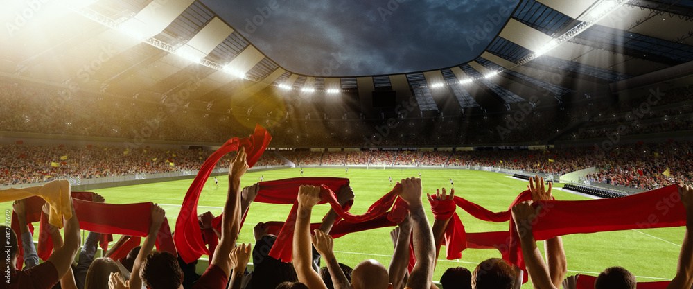 Victory. Back view of football, soccer fans cheering their team with scarfs at crowded stadium at evening time. Concept of sport, competition. Out of focus effect
