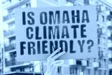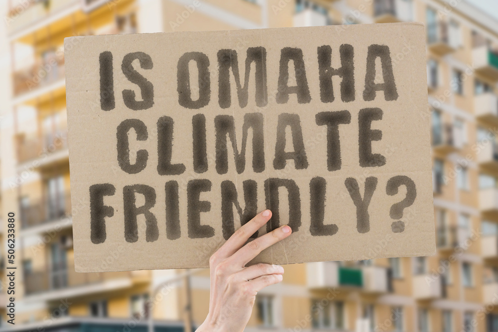 The question " Is Omaha climate-friendly? " is on a banner in men's hands with blurred background. Support. Team. Activist. Urban. Sunset. Carbon. Ecology. Energy. New. Clean. Warming. Waste