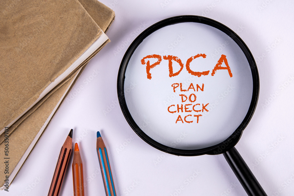PDCA Plan Do Check and Act. Pencils and magnifying glass on a white background