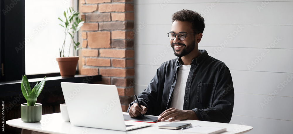 Young man student using laptop computer at home studying online panoramic banner. Creative professional working in office. Distance study, work from home, e-learning, business, meeting online