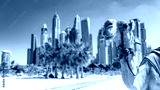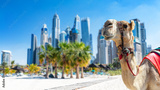 Camel on Dubai jumeirah beach with marina skyscrapers in UAE