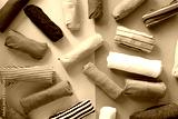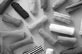 close up of rolled colorful t shirt clothes on yellow and green table background, travel concept