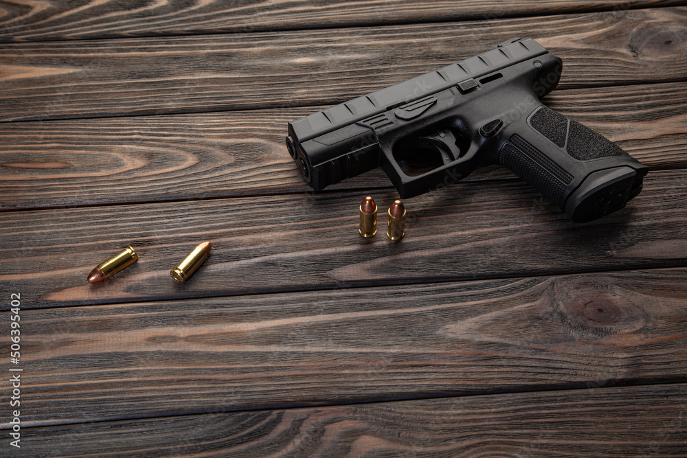 Pistol and cartridges for it on a wooden back. A short-barreled weapon for self-defense.