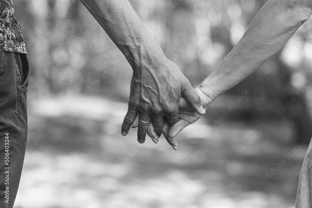 The husband's hand firmly holds the wife's hand close-up. Loving couple walking and holding hands. Reliable and strong marriage. The concept of romance, fidelity in marriage and love. Black and white