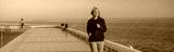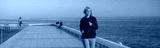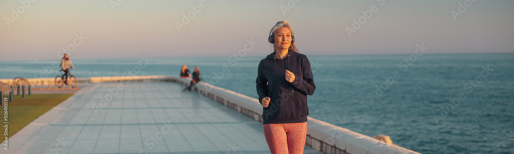 Asian sportswoman wearing black hoodie jogging on the embankment against the background of sea and listening to music in headphones