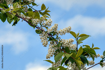 A blooming branch of lilac against the blue sky on a spring day