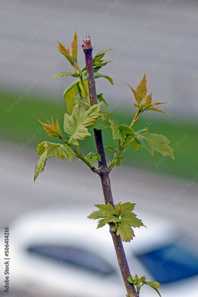 A sprig of maple with young leaves over the highway on a spring day