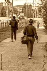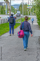 A woman with a shoulder bag walks along the sidewalk on a spring day