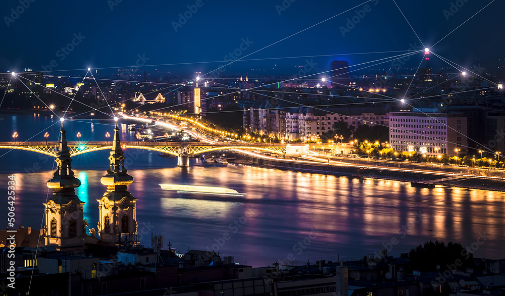 Smart digital city with abstract technology hologram. Concept of globalization and connection. High speed of next generation network 5G