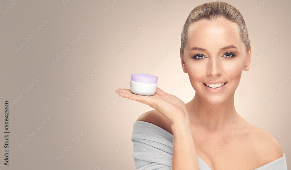 Beautiful smiling female model with clean skin, wearing in bathrobe hold cream on beige isolated.