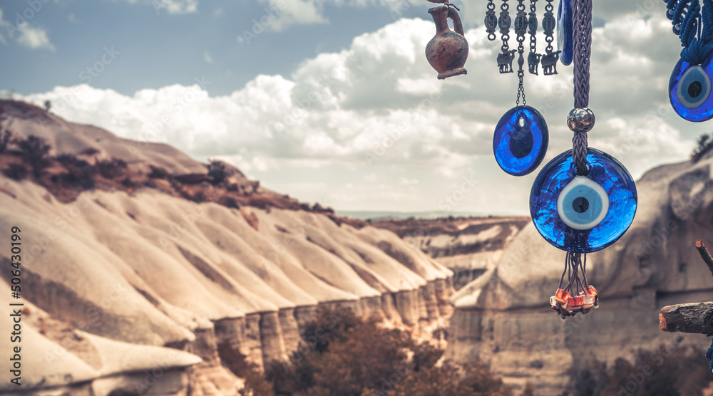 Evil eye amulets on turkish mountains panoramic background
