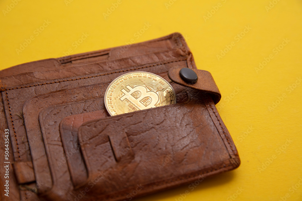 Brown leather crypto curreency wallet with a bitcoin gold coin. Digital finance concept