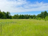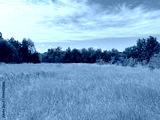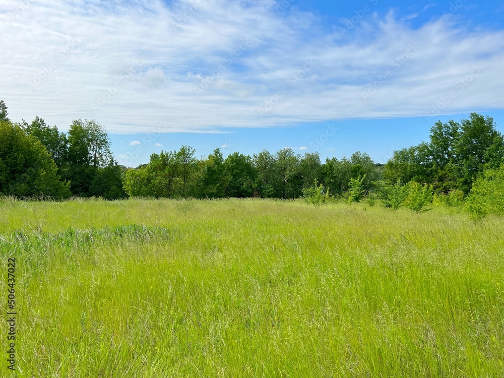 Beautiful landscape with green grass and blue clouds sky at summer sunny day. Scenic meadow near forest.