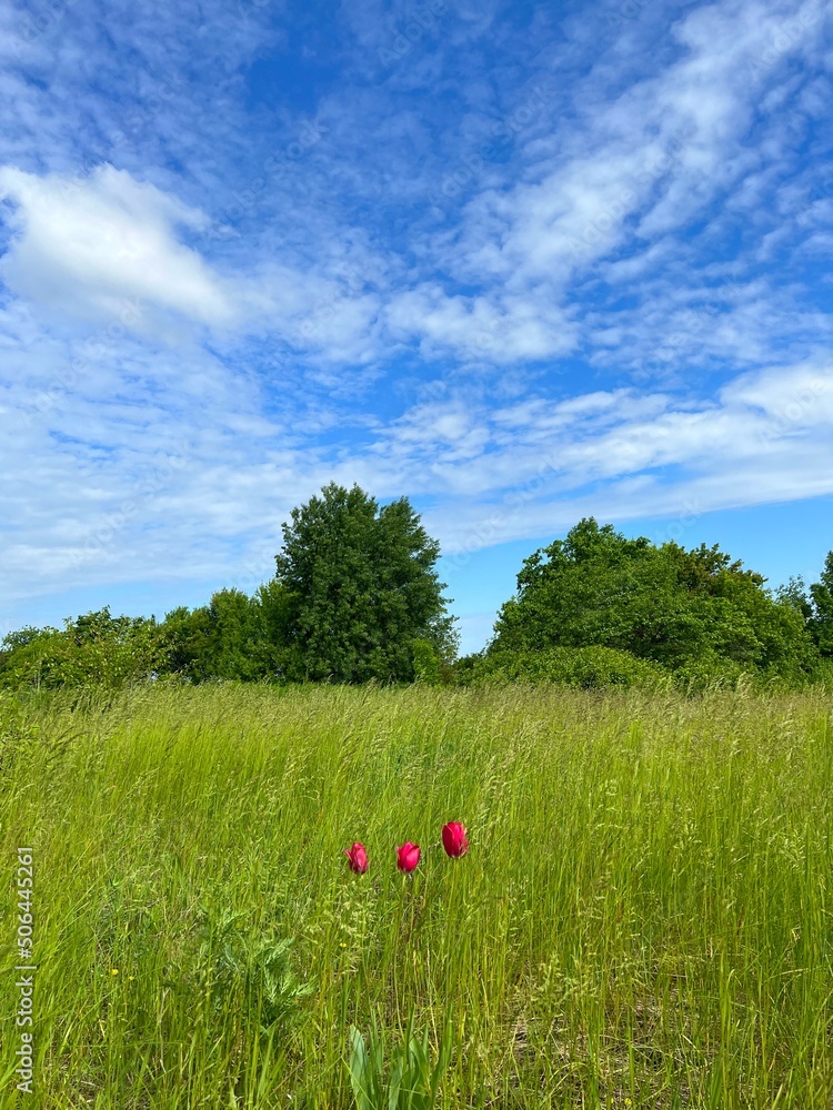 Beautiful green grass field and and blue sky at summer day. Idyllic rural nature.