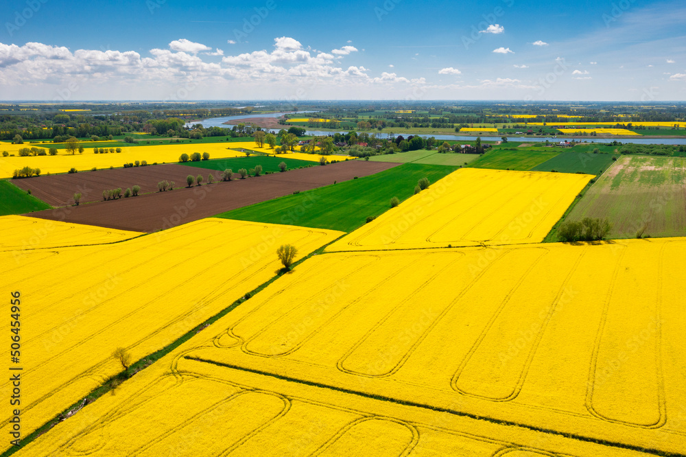 Aerial landscape of the yellow rapeseed field under blue sky, Poland