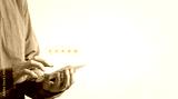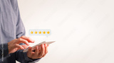 close up men using smartphone with pop up five stars icon, give feedback five stars for satisfaction, Satisfaction in service concept