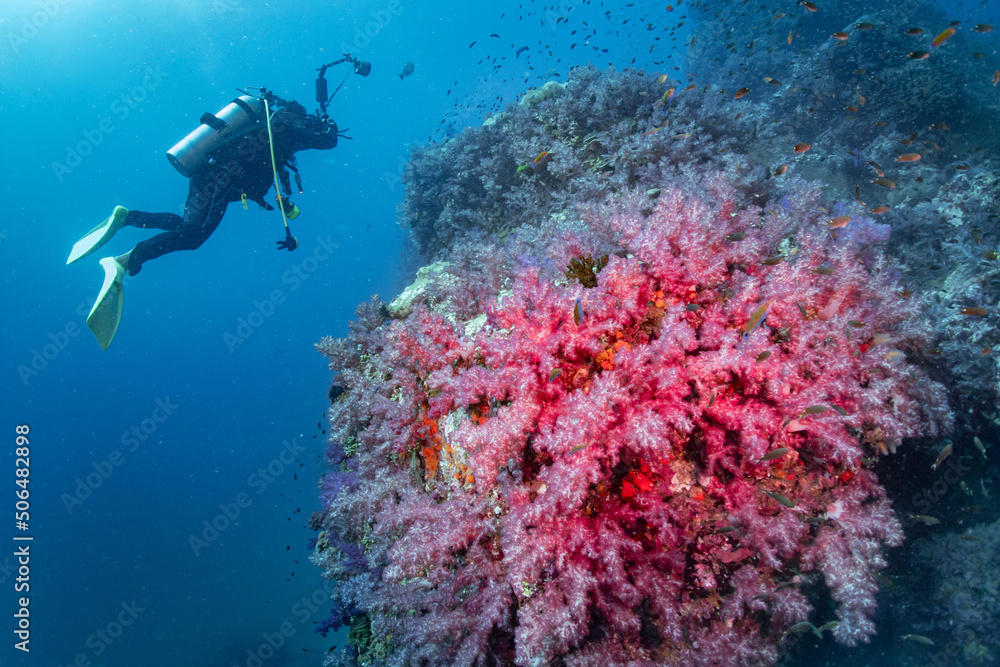 Pink soft coral and scuba diver holding camera at Richelieu Rock dive site, North andaman. Exotic underwater landscape in Thailand