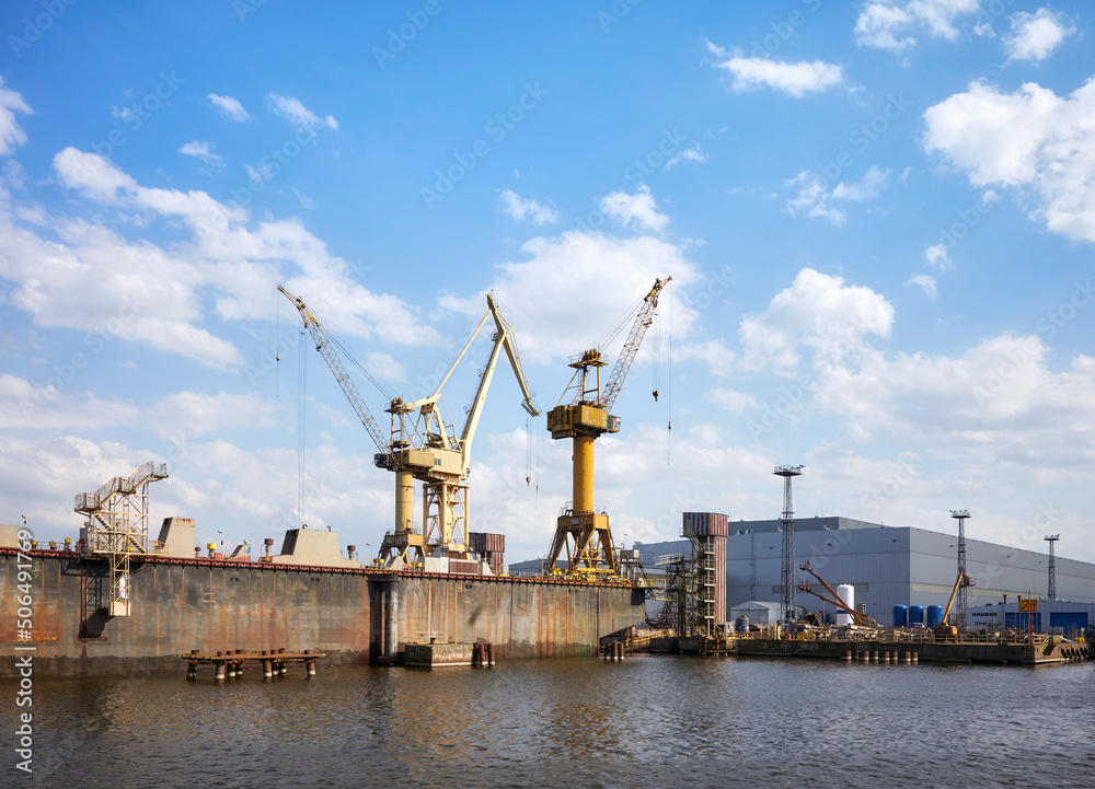 Shipyard in Szczecin seen from the water, Poland.