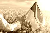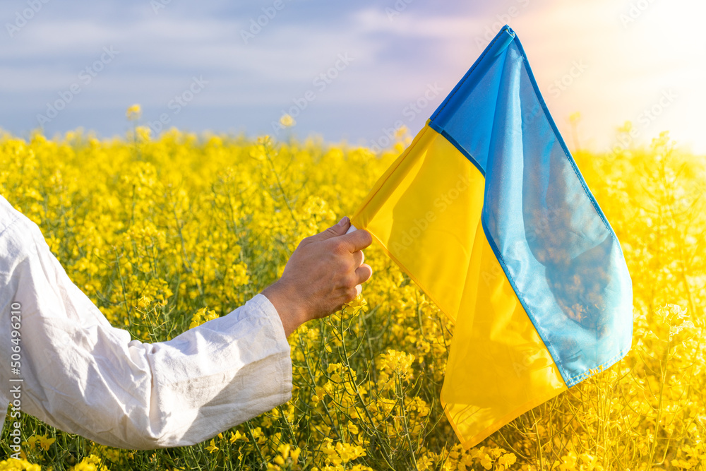 A Ukrainian farmer holds a flag of Ukraine over a blooming farmland on a sunny day, The concept of the problems of Ukrainian agriculture and the blockade in the export of cereals to the whole world