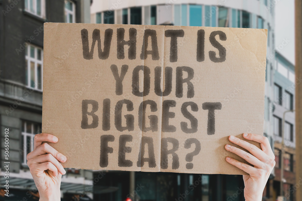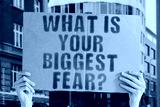 The phrase " What is your biggest fear? " is on a banner in men's hands with blurred background. Positive. Collapse. Life. Avoid. Prevent. Forbid. Expression. Motivation. Person. Bravery. Business