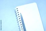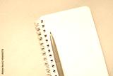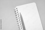 Mockup empty spring notebook with white pen close-up. Fresh green background with copy space.
