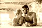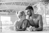 A lovely couple standing in the pool with thermal and mineral water and looking each other in the eyes. Romantic moments at spa and wellness center. Couple at the spa.