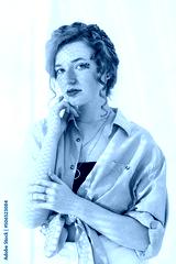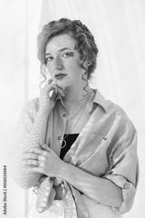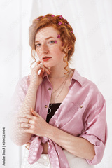 Beautiful fashionable redhead freckled woman wearing classic lilac color silk shirt with knot, many rings, necklace