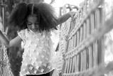 Happy little girl climbing on the bridge in adventure park, having fun at playground on a sunny day