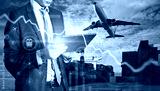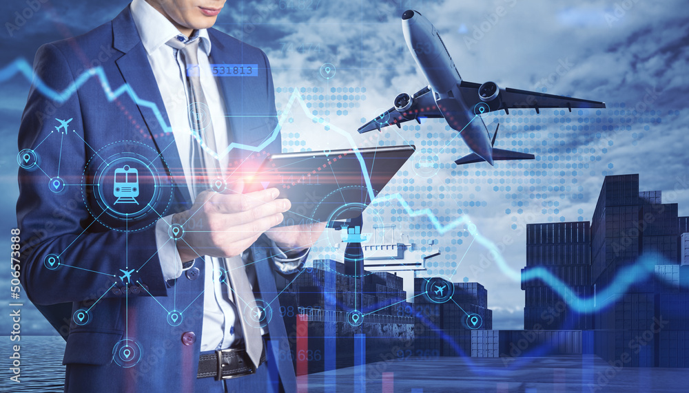 Close up of businessman hand holding tablet or cellphone with abstract glowing shipping hologram on dock with transport background. Export, logistics and freight concept. Double exposure.