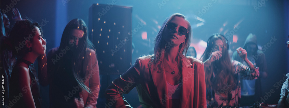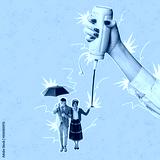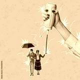 Contemporary art collage. Stylish couple walking under umbrella isolated over pink background. Female hand squishing ketchup