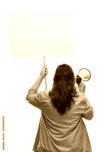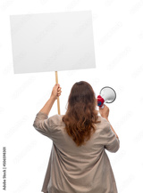 feminism and human rights concept - woman with poster and megaphone protesting on demonstration over white background