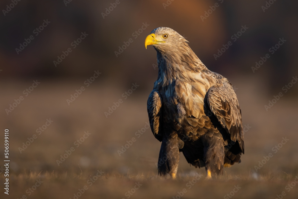 Adult white-tailed eagle, haliaeetus albicilla, sitting on the ground in the autumn at sunrise. Large bird of prey on a meadow with blurred background and copy space.