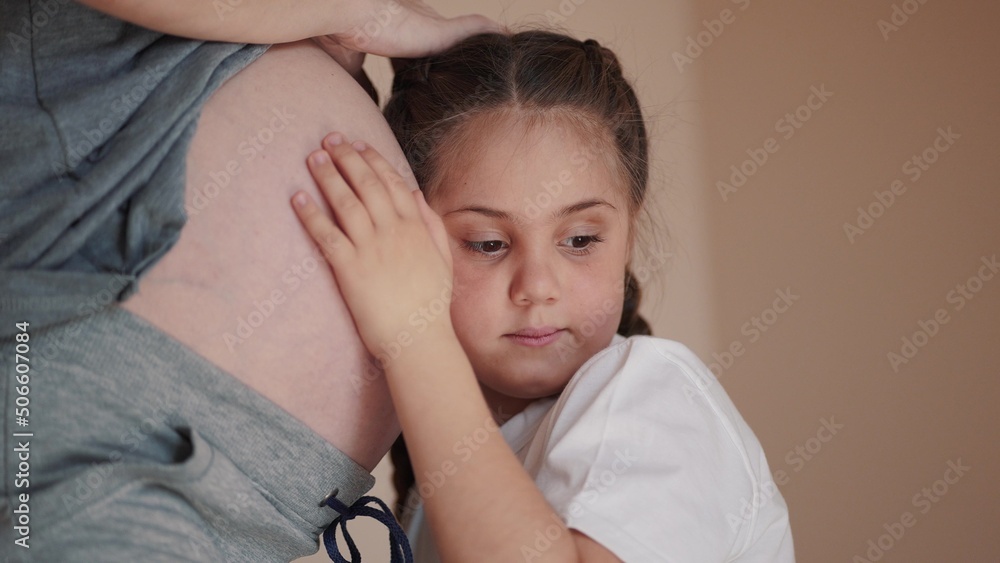 little girl hugs her mother belly. happy family kid pregnancy newborn concept. the daughter lifestyle sent her ear to the belly of the pregnant mother listens to the thrusts of dream the newborn