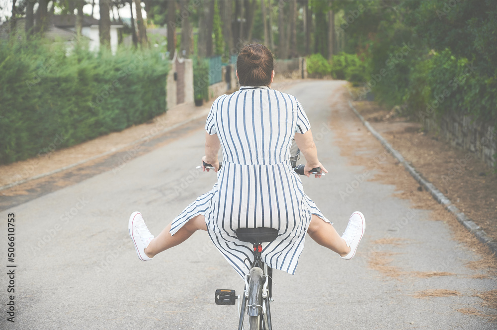 Unrecognizable young adult woman with a bow in her hair and a striped dress enjoys a beautiful summer day riding a bike. Summertime activities concept.
