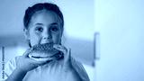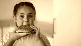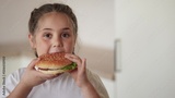 little girl eating a hamburger. unhealthy fast food proper nutrition concept. child greedily with pleasure bites a big burger in the kitchen at home lifestyle. kid eats fast food close-up
