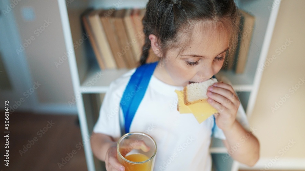 schoolgirl eats a sandwich drinking juice at school during recess education with backpack and bookcase. child lunch concept. child in classroom having lunch snack with bread and cheese sandwich