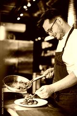 Man chef cooking asian chicken at a cafe kitchen