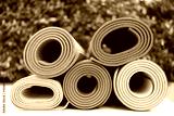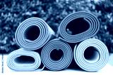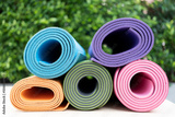 close up of colorful yoga mat on the table, sport and healthy concept