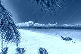 Maldives island beach with blue kayak on shore. Tropical landscape of summer, white sand with palm trees. Luxury travel vacation destination. Exotic beach landscape. Amazing nature, relax, freedom