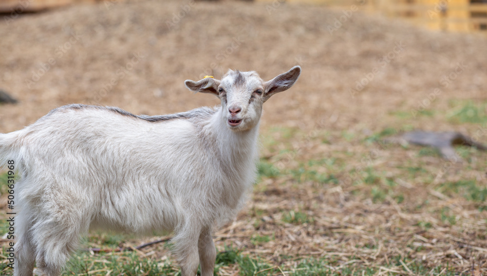 A small goat on the farm grazes and plays. Breeding goats and sheep. Housekeeping.