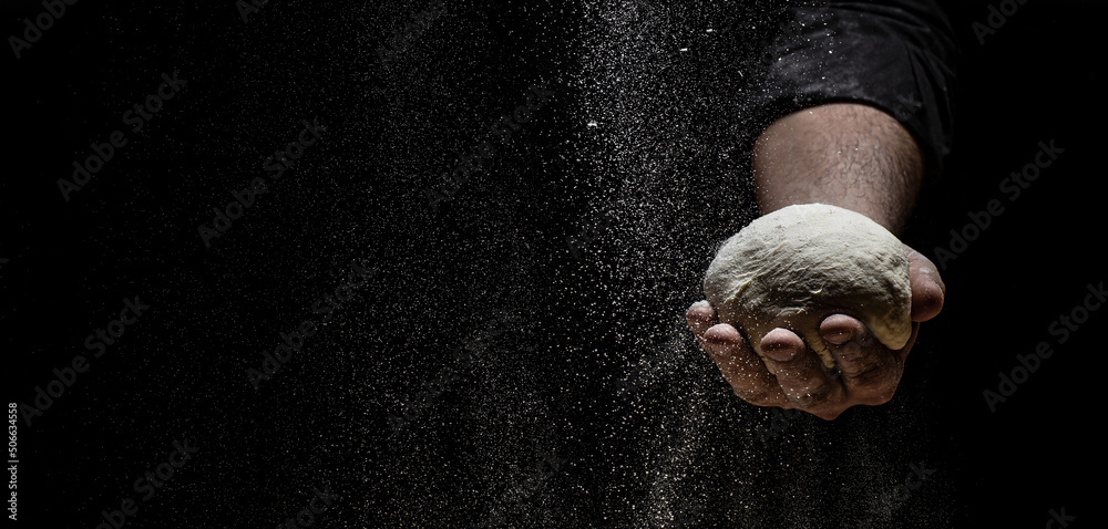 Man preparing bread dough in a bakery on dark background. Long banner format, space for text
