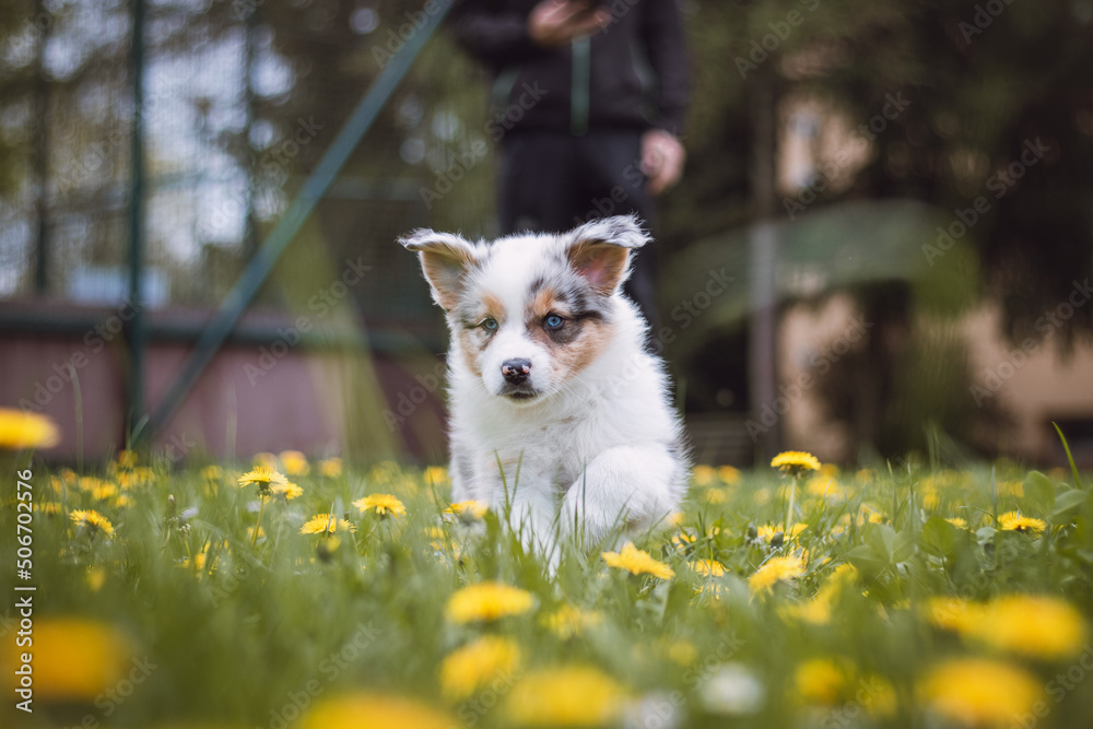 Furry devil in the form of an Australian Shepherd runs around the garden and enjoys his freedom. A white and brown puppy with a happy expression. Dandelion field