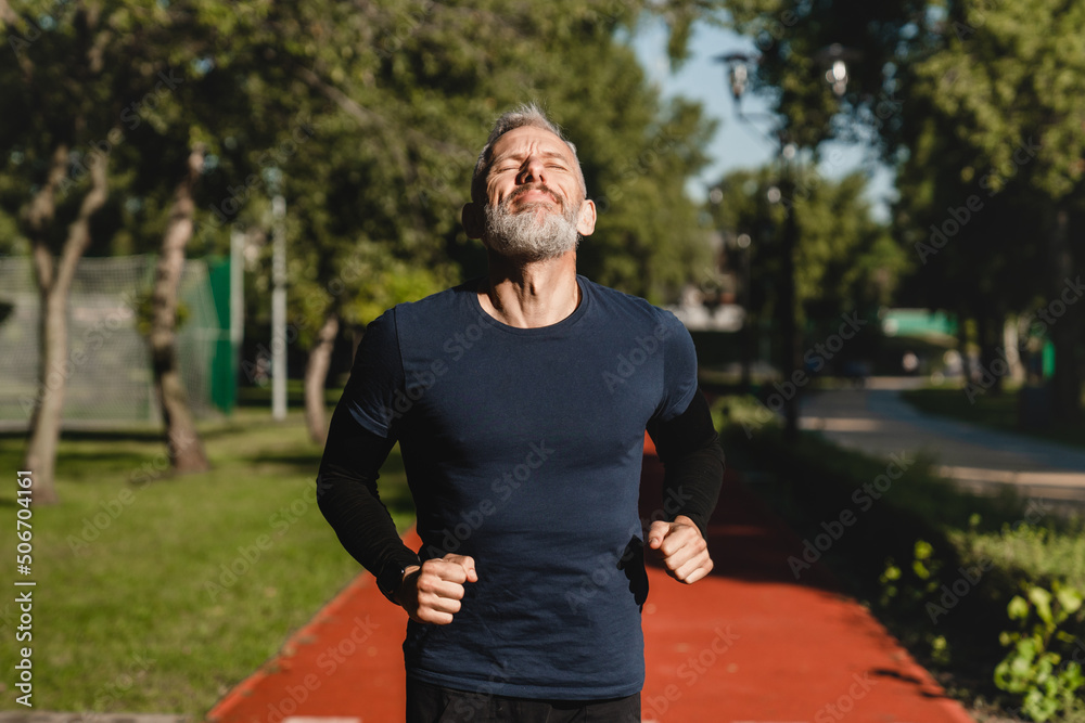 Achieve goal. Mature caucasian male athlete runner sportsman jogging running, feeling free in the morning. Active lifestyle.