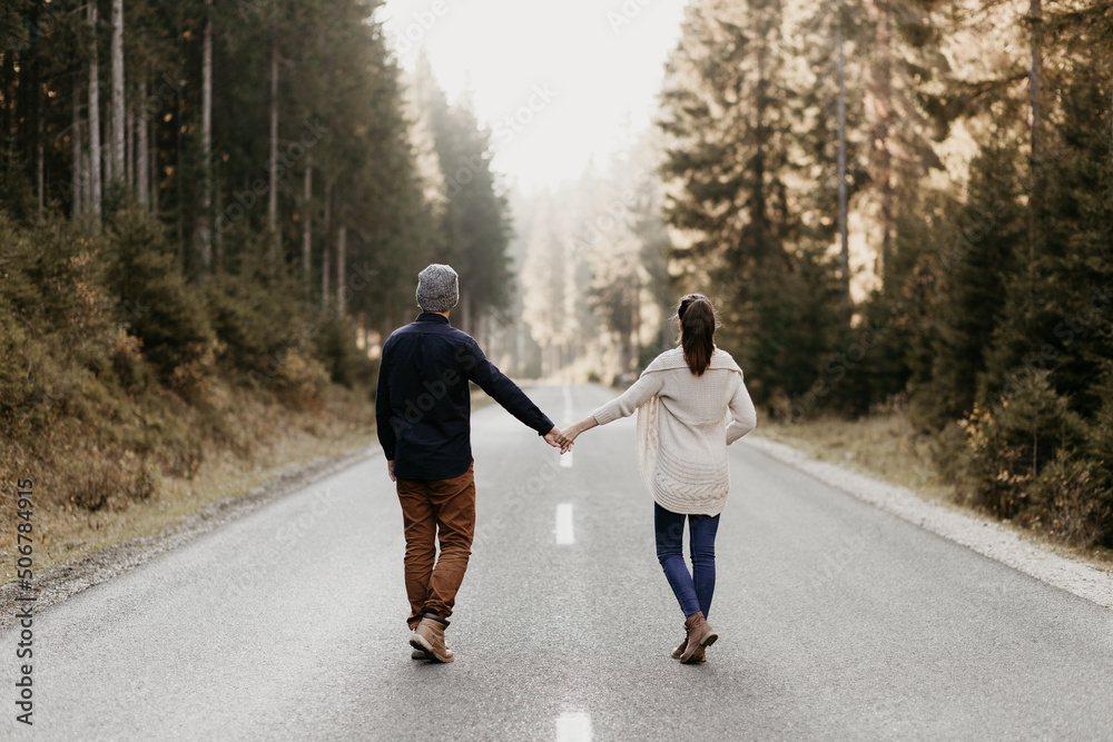 A couple in love is walking on an epmty road in the forest. Holding hand and keeping distance as they walk. Good relationship, active lifestyle. Together on the way. They face the distance.
