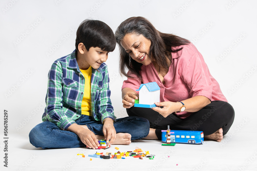 Happy indian grandmother and grandson playing with colorful Toys, Isolated on white studio background, Grandma Teaching Male Grandchild, Learning Concept.