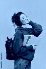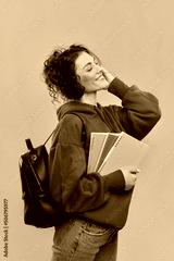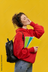 Side view of female student listening to music in earphones. Girl standing with rucksack, holding books, looking up with closed eyes, smiling. Isolated on yellow background.