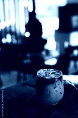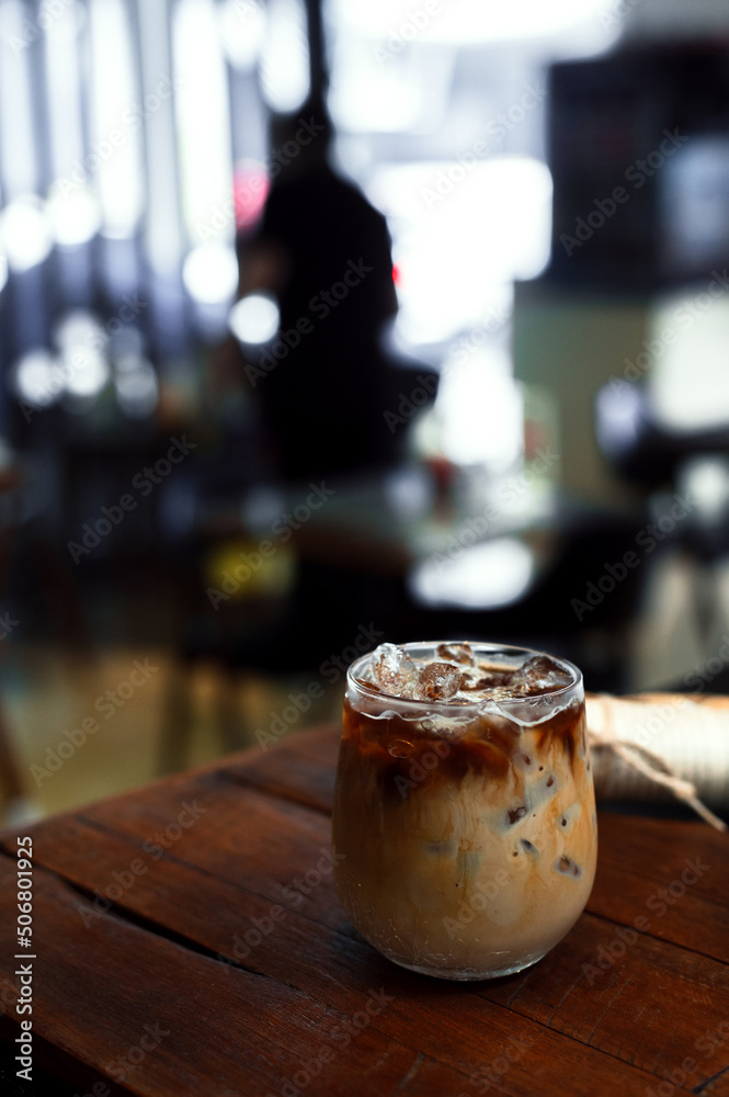 Ice coffee on a table with cream being poured into it showing the texture and refreshing look of the drink
